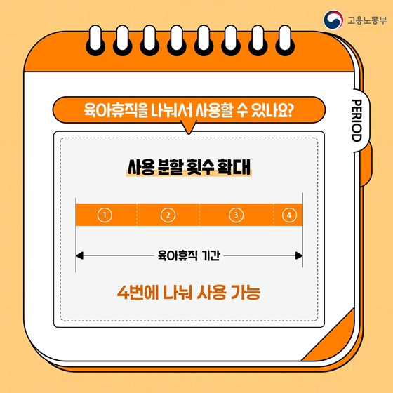 또한, 육아휴직을 더욱 유연하게 사용할 수 있도록 분할 사용 횟수도 늘어났습니다. 기존에는 1회로 제한되었던 분할 사용을 이제는 최대 4회까지 나누어 사용할 수 있게 되었습니다. 이를 통해 근로자들은 자신의 상황에 맞게 더욱 탄력적으로 육아휴직을 활용할 수 있게 되었습니다.