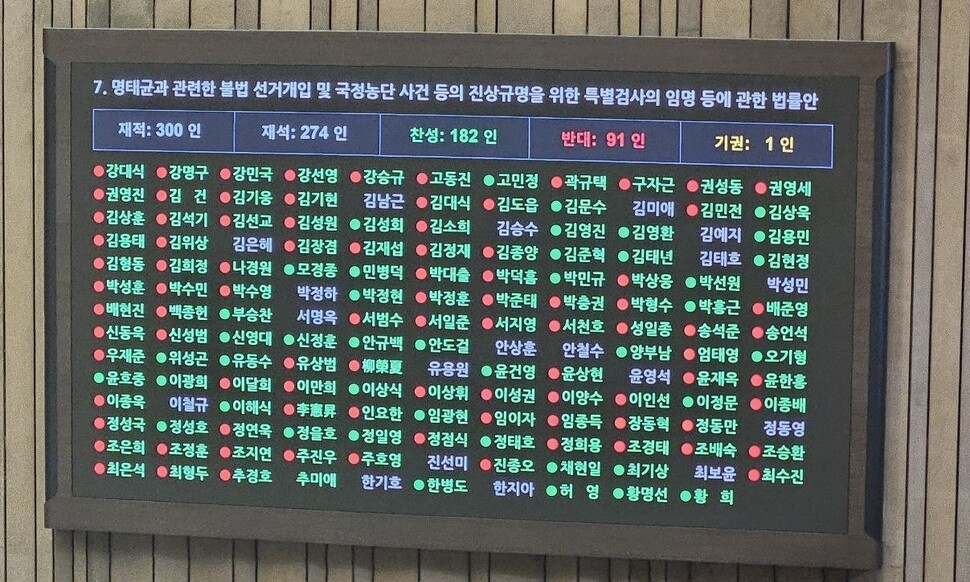 투표 결과, 재석 의원 274명 중 찬성 182명, 반대 91명, 기권 1명으로 법안이 가결되었습니다. 더불어민주당을 비롯한 야당 의원들이 대거 찬성표를 던진 반면, 국민의힘 의원들은 대부분 반대표를 행사했습니다. 다만, 국민의힘 김상욱 의원은 당론과 달리 찬성표를 던져 주목을 받았습니다.