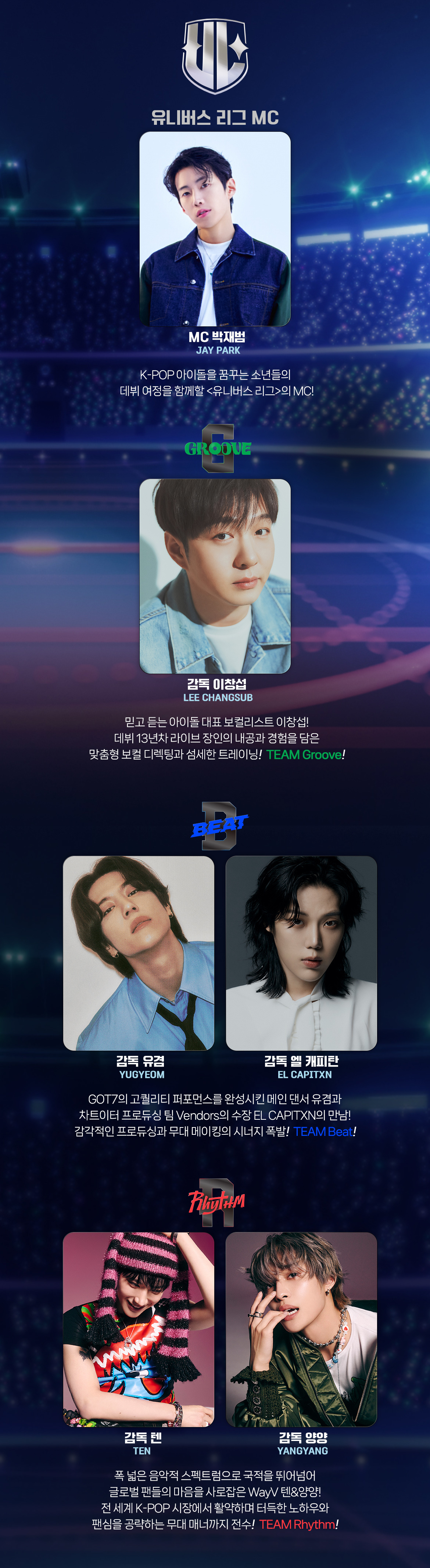 유니버스 리그의 MC는 박재범이 맞춤형 보컬 디렉팅과 섬세한 트레이닝을 책임지는 TEAM Groove 감독에 이창섭, 퍼포먼스를 책임치는 TEAM Beat 감독에는 유겸 과 엘 캐피탄이, 글로벌 팬들의 마음을 사로잡은 TEAM Rhythm 의 감독으로는 텐과 양양이 활약합니다.