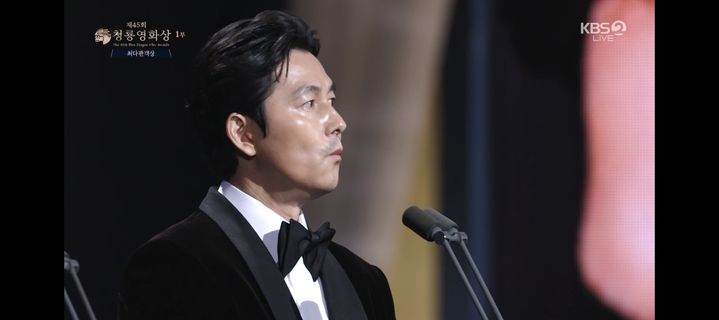 "연기 시작할 때 '나도 시상식에서 남우주연상 받을 수 있을까' 했을 때 아내가 당연히 받을 수 있다고 용기를 줬습니다. 저는 그런 날이 안 올 줄 알았는데 이 자리에서 세 번이나 남우주연상을 받았습니다."