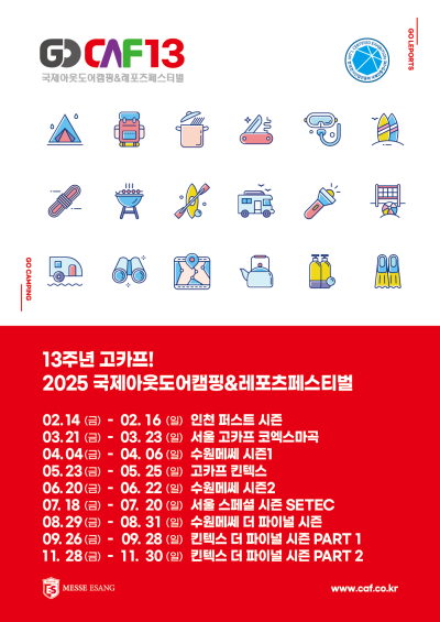 2025 고카프 인천 퍼스트 시즌은 13년의 역사를 자랑하는 대한민국 대표 캠핑∙아웃도어∙레포츠 박람회로, 매년 많은 참가기업과 방문객들의 호응을 얻고 있습니다. 이번 행사 역시 캠핑 산업의 최신 동향을 제시하고, 시장 활성화에 기여할 것으로 기대됩니다. 캠핑을 사랑하는 모든 이들에게 새로운 영감과 즐거움을 선사할 이번 행사에 많은 관심과 참여가 있기를 바랍니다.