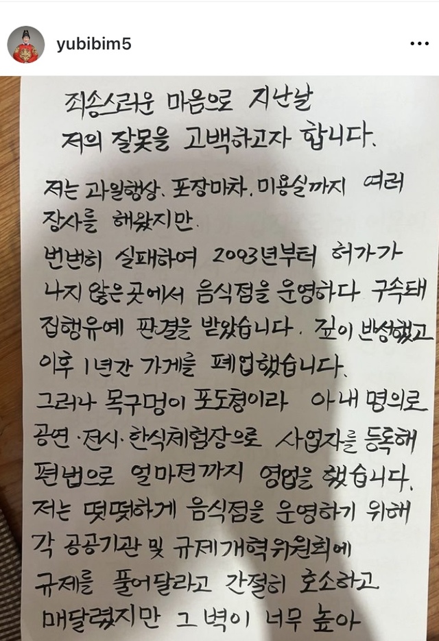유비빔 씨는 11월 1일 자신의 인스타그램을 통해 과거 불법 영업 사실을 고백했습니다. 그는 2003년부터 허가 없이 음식점을 운영하다 구속되어 집행유예 판결을 받았으며, 이후에도 아내 명의로 편법 영업을 계속했다고 밝혔습니다.