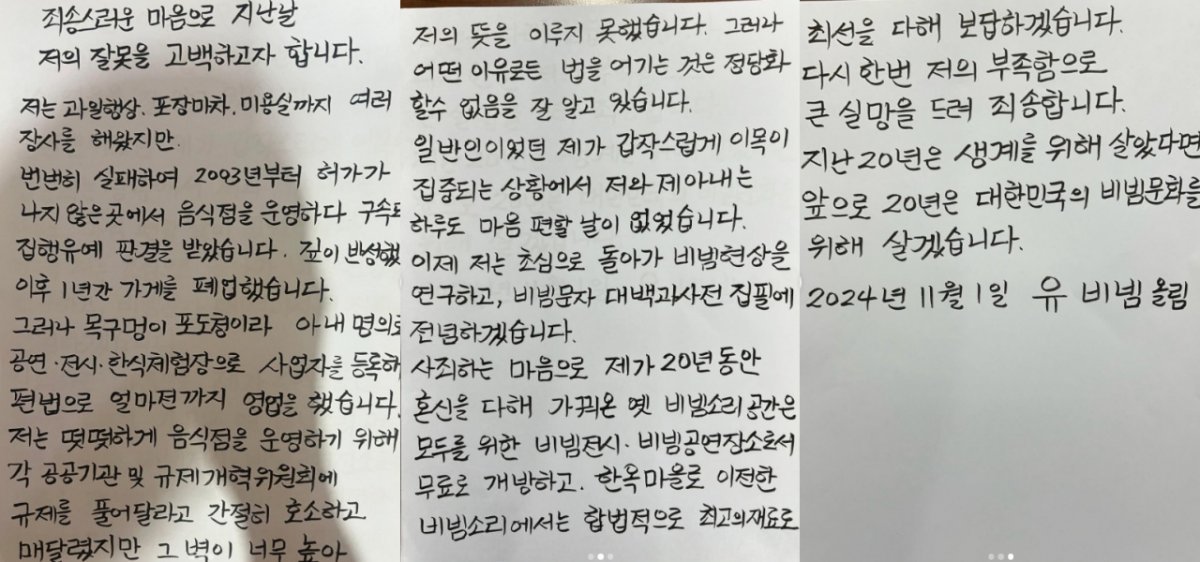 또한, 그동안 운영해온 음식점 공간을 비빔 전시와 공연 장소로 무료 개방하겠다고 약속했습니다. 이는 자신의 잘못을 인정하고 새로운 시작을 하겠다는 의지로 보입니다.